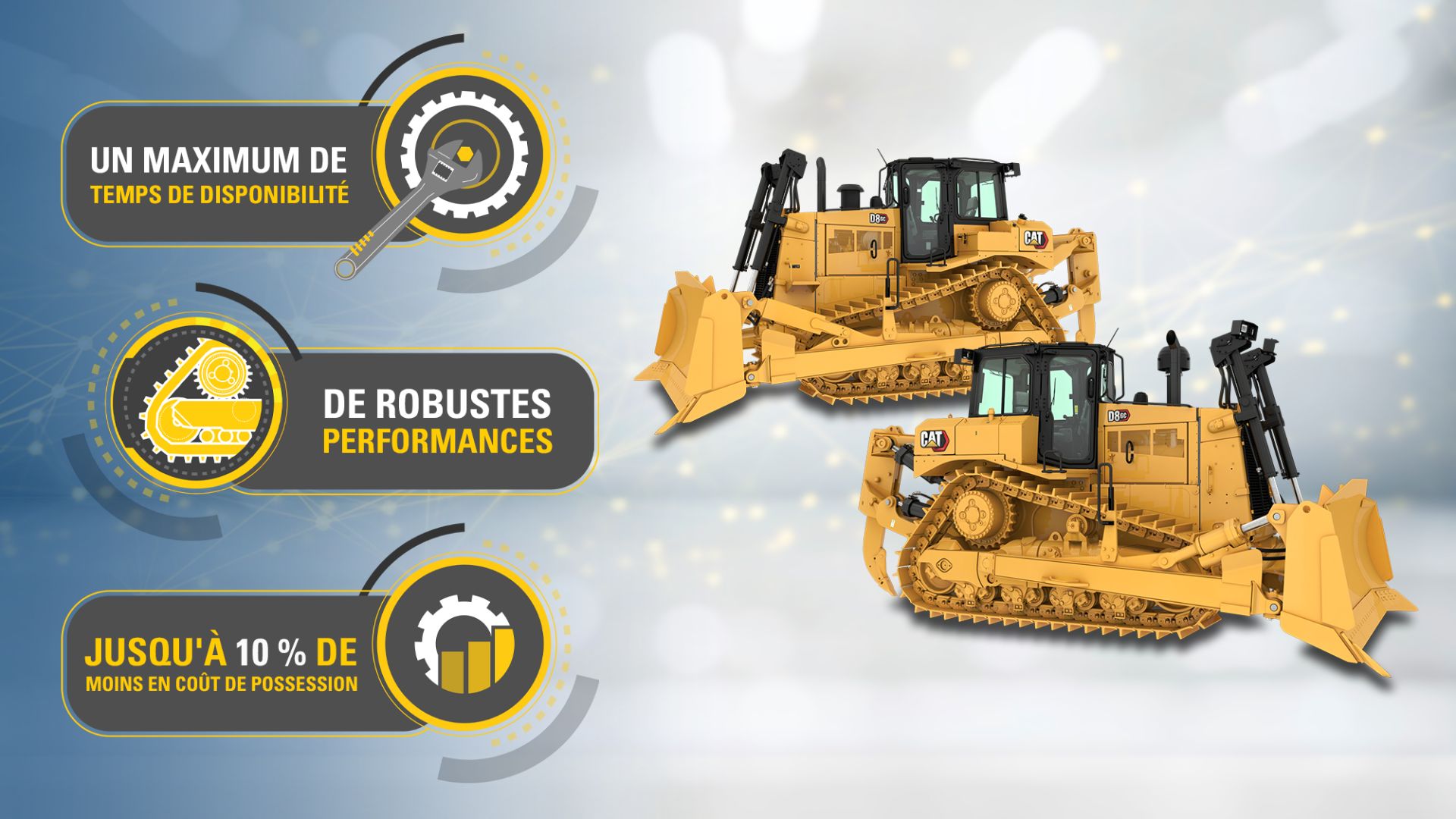 Bénéficiez d’un coût de propriété jusqu’à 10 % inférieur à celui du D8T. Des choix comme le train de roulement GD (usage général) et un ripper simplifié permettent de réduire le prix d’achat initial.